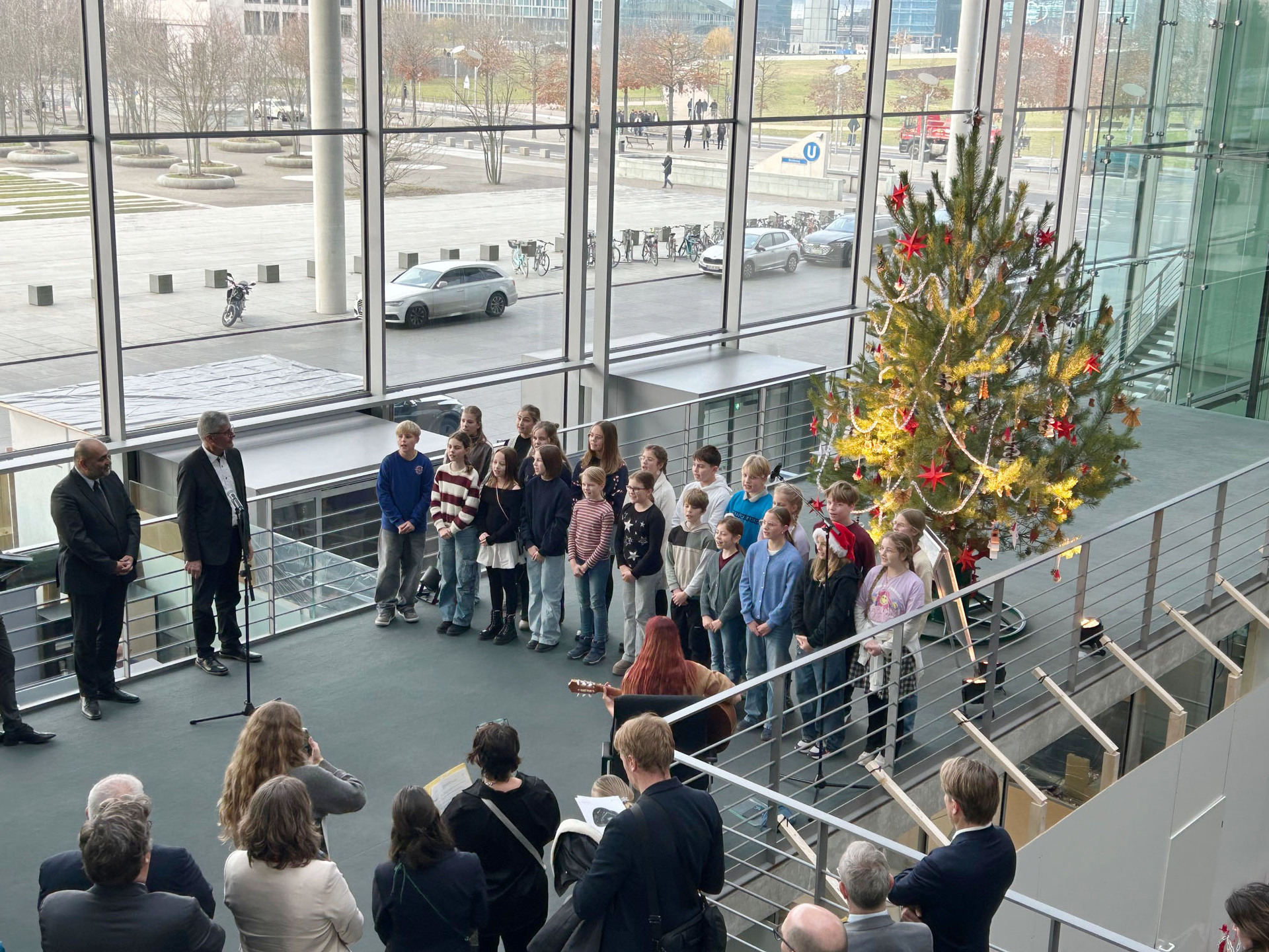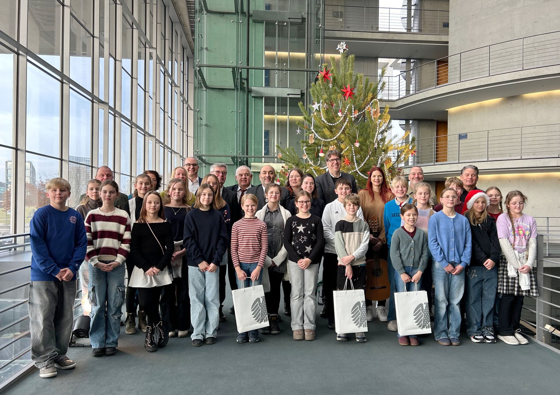Zuvor hatten die Kinder und Musiklehrerin Anne Kuhlmann mit dem Lied „In stiller Nacht" zusätzlich für Weihnachtstimmung gesorgt und die Vorfreude auf Weihnachten gefeiert. Auch an die herbeigeströmten Bundestagsabgeordneten und ihre Mitarbeitenden sowie die bereits anwesenden Gäste, wie den Landrat a.D. Friedrich Heuwinkel, Präsident des Verbandes Deutscher Naturparke e.V., Dr. Aija Torkler, Leiterin des Naturparks Barnim, Gunnar Heyne, Direktor der Berliner Forsten und den Abgeordneten des Wahlkreises 057 Uckermark-Barnim I, Stefan Zierke, wurde der Notentext verteilt, so dass dank des Liedes im Paul-Löbe-Haus die Schneeflocken tanzten und die Sterne leuchteten.