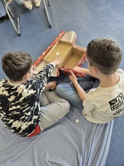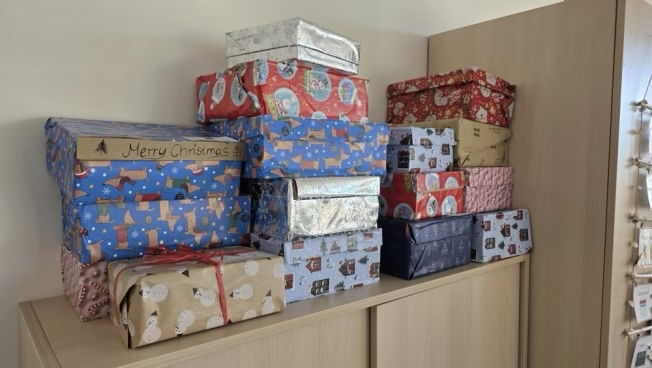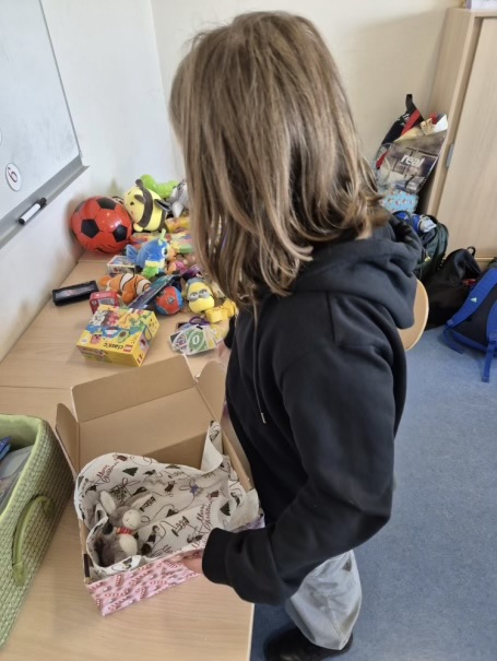 Für die Pakete brachten die Kinder Hygieneartikel, Spielzeug, Schreibwaren, Süßigkeiten und andere nützliche Dinge von zuhause mit. Gemeinsam wurden die Kartons sortiert, gefüllt und mit fröhlichem Weihnachtspapier beklebt.