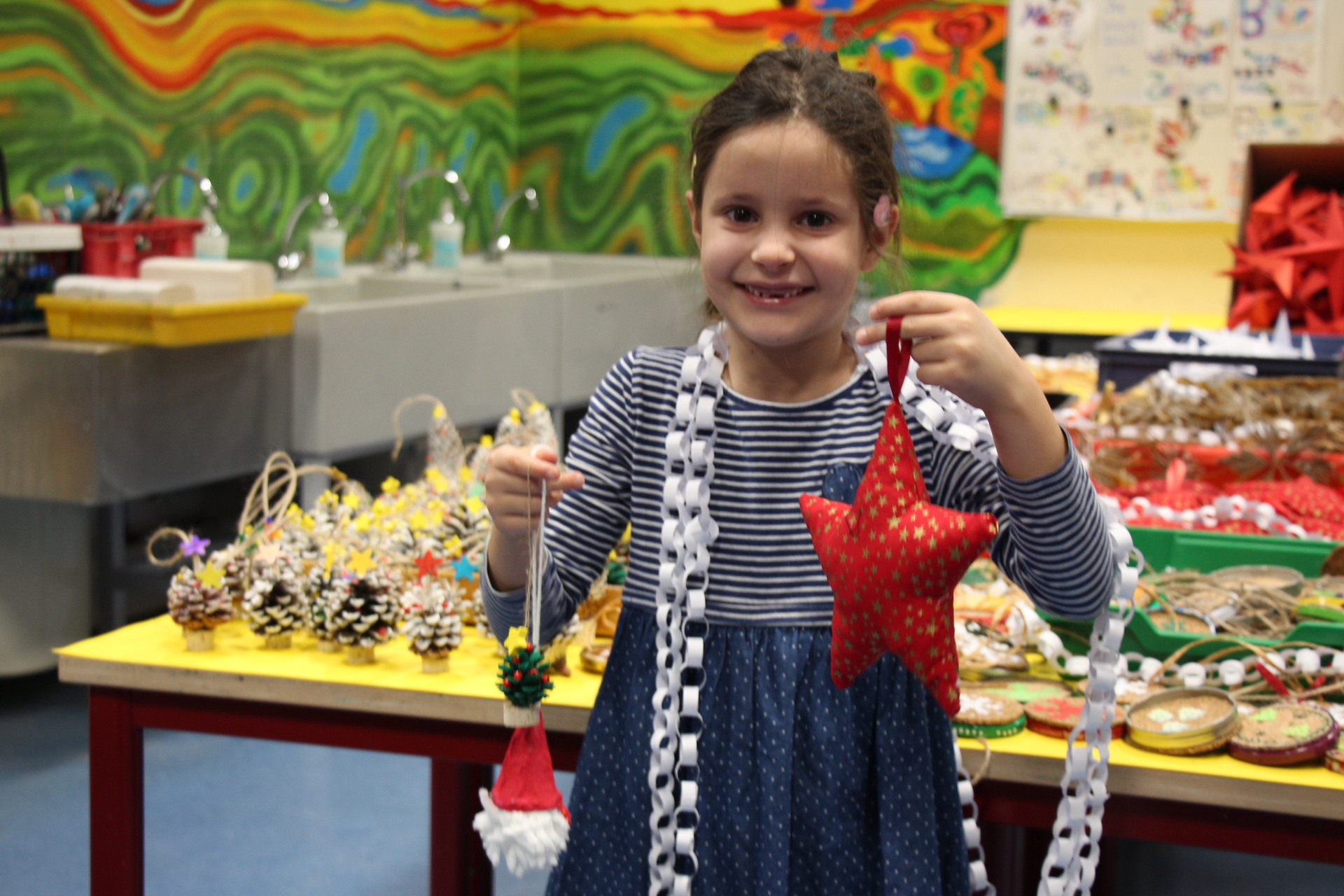 So entstanden in den sechsten Klassen Anhänger aus Ton. Die Fuchs-Klasse aus der Jahrgangsstufe 3 hatte aus getrockneten Orangenschalen kleine Fuchs-Gesichter gezaubert. Dass es sich bei den filigranen Sternen um das Innenleben von Toilettenpapier-Rollen handelt, kann der Betrachter dank der goldfarbenen Auflage kaum erkennen. Außerdem lachen kleine Wichtel aus Wollresten mit knallroten Hüten aus Eierverpackungen vom Deko-Tisch. Stolz stehen die „eingeschneiten" Weihnachtsbäume aus Kienäpfeln der Erstklässler in Weiß, Rot und Grün daneben. Die Arbeitsgemeinschaft Nähen hat rot-goldene Weihnachtssterne beigesteuert. Meterlange weiße Schlangen aus Papier sollen als Lametta-Ersatz dienen.
