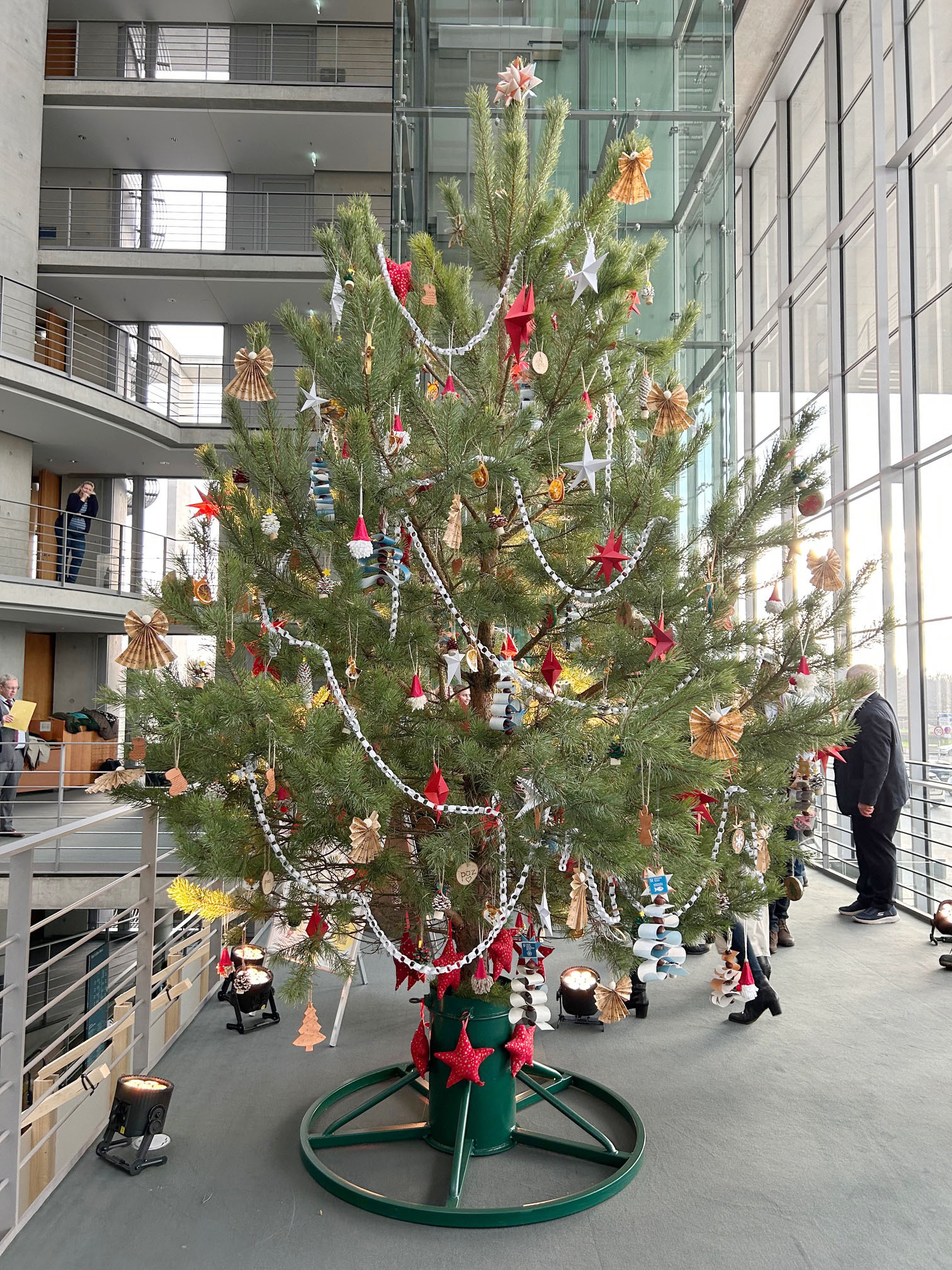 Majestätisch steht sie im Paul-Löbe-Haus in Berlin und stimmt die Bundestagsabgeordneten auf die Weihnachtszeit ein. Die Rede ist von der ca. vier Meter großen Märkische Kiefer aus der Schönower Heide, für deren prachtvollen Schmuck die Schülerinnen und Schüler der Grundschule Schönow gesorgt haben. Als Dankeschön für ihre Kreativität und ihren Fleiß durfte eine Schülergruppe aus Schönow den festlich geschmückten Baum am Mittwoch, dem 4. Dezember, offiziell an den stellvertretenden Präsidenten des Deutschen Bundestages, Omid Nouripour (Bündnis 90/Die Grünen), übergeben.