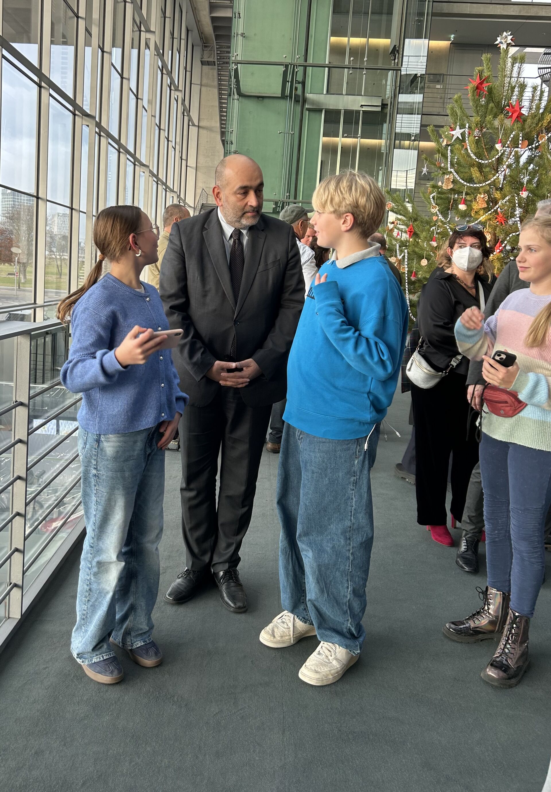 Nach der Übergabe des Weihnachtsbaums nahm sich der stellvertretende Präsident des Deutschen Bundestages, Omid Nouripour (Bündnis 90/Die Grünen), noch Zeit für Gespräche mit den Kindern und für Selfies. „War das ein aufregender Tag", resümiert Hannah. „Wir haben so viel Neues erfahren, haben eine Führung durch den Bundestag erlebt und durften die Reichstagskuppel besuchen. Einfach klasse", so die Sechstklässlerin.
