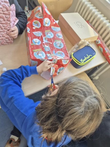 Für die Pakete brachten die Kinder Hygieneartikel, Spielzeug, Schreibwaren, Süßigkeiten und andere nützliche Dinge von zuhause mit. Gemeinsam wurden die Kartons sortiert, gefüllt und mit fröhlichem Weihnachtspapier beklebt.
