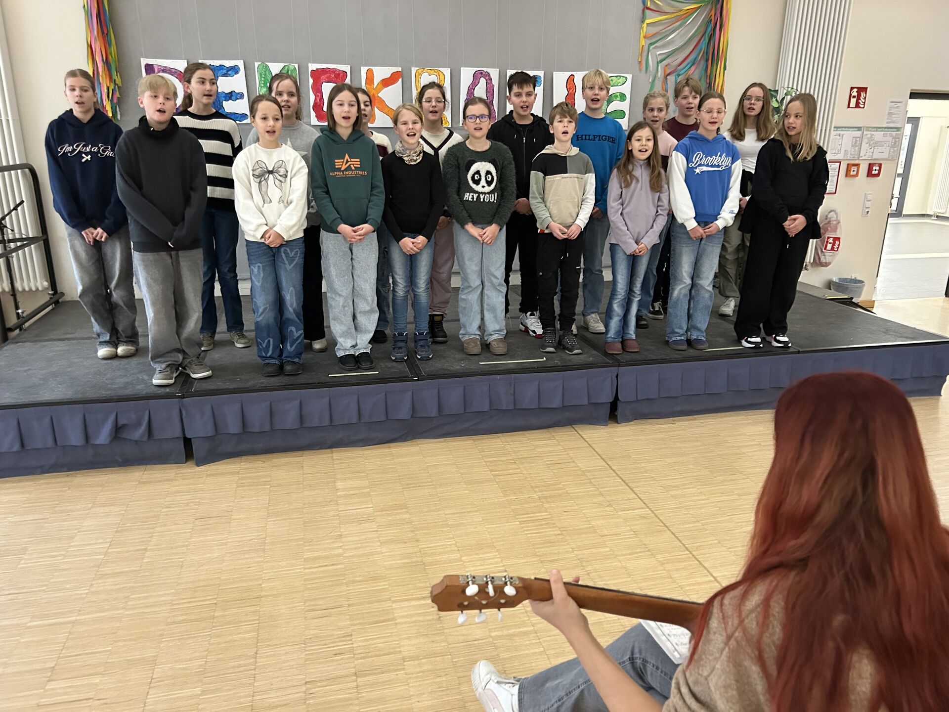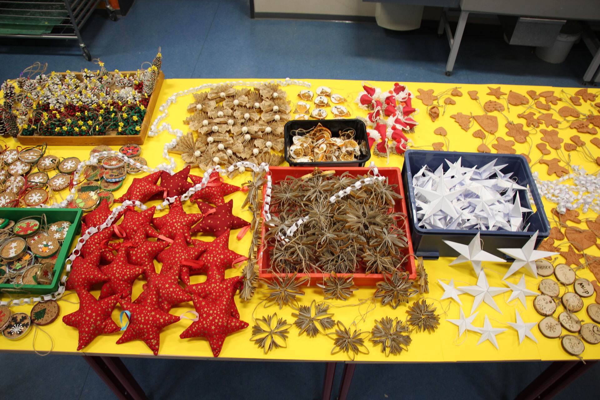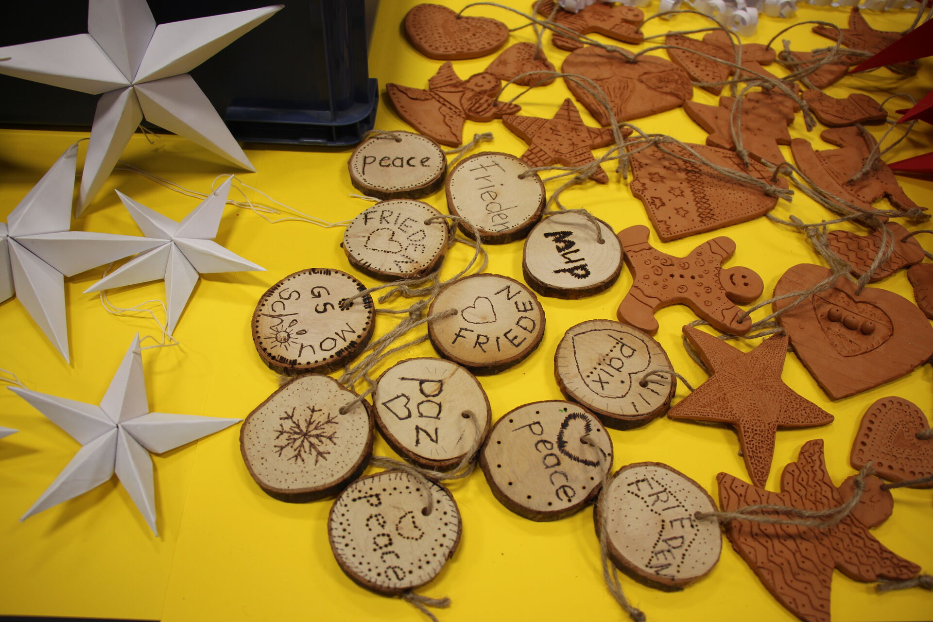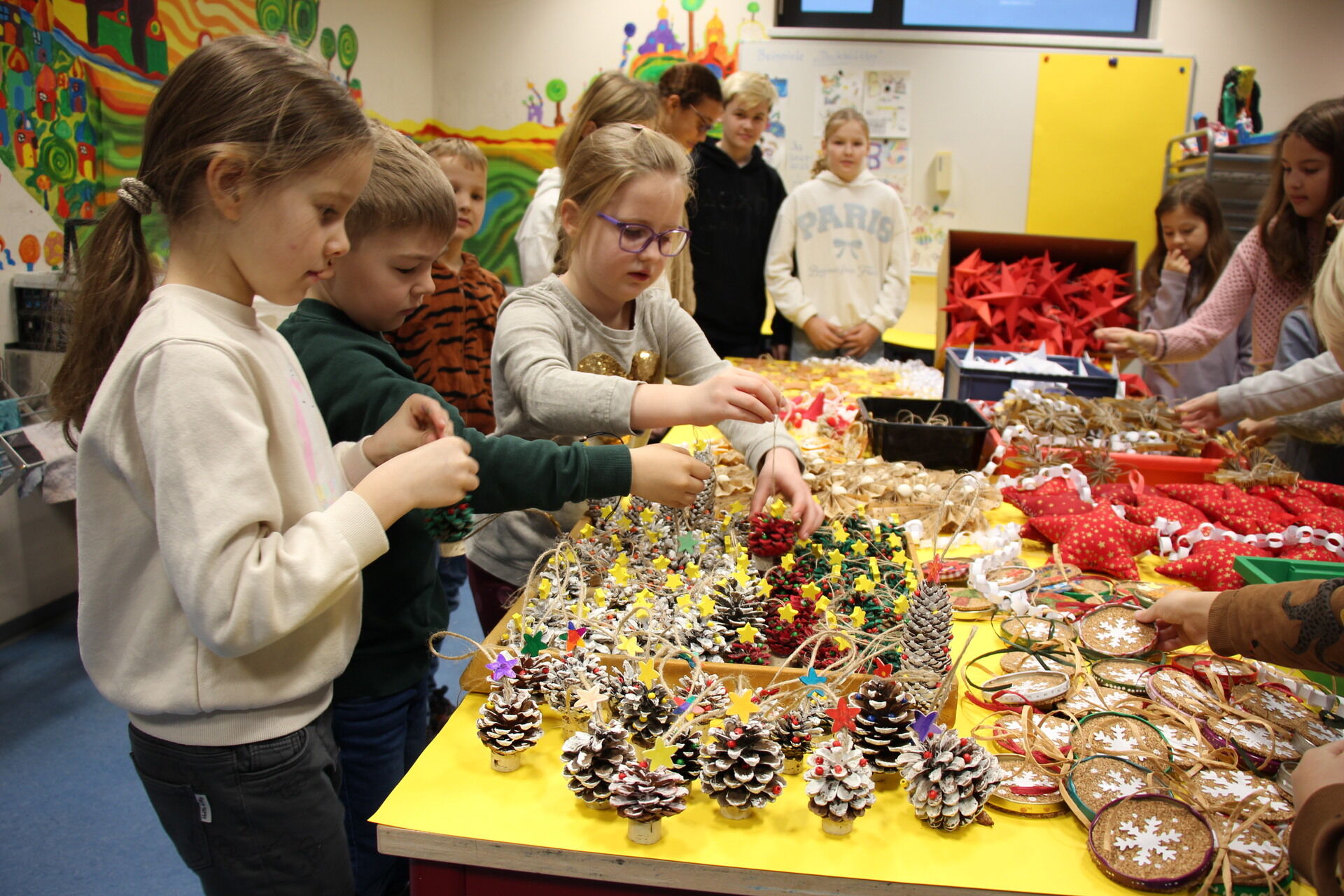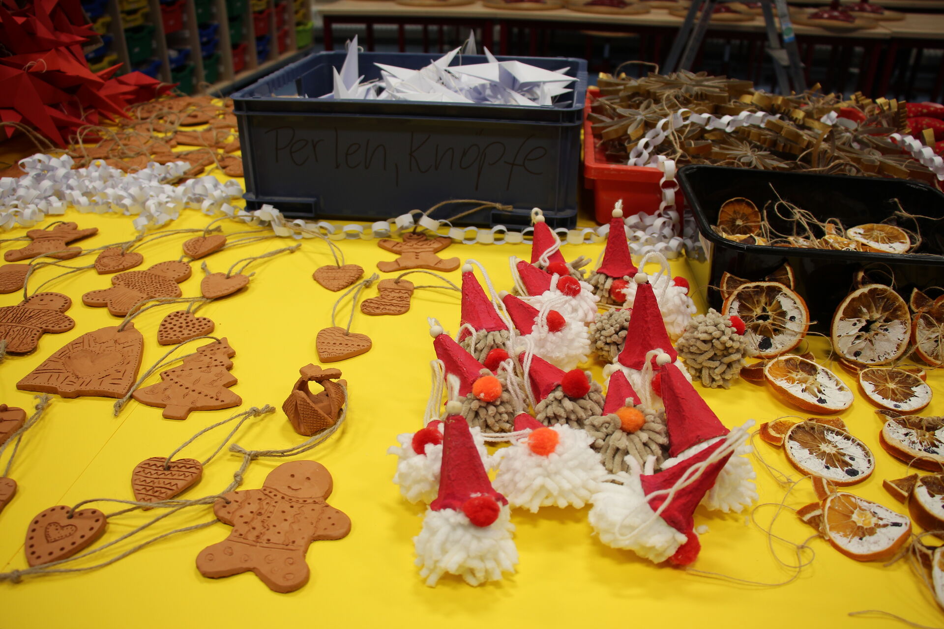 So entstanden in den sechsten Klassen Anhänger aus Ton. Die Fuchs-Klasse aus der Jahrgangsstufe 3 hatte aus getrockneten Orangenschalen kleine Fuchs-Gesichter gezaubert. Dass es sich bei den filigranen Sternen um das Innenleben von Toilettenpapier-Rollen handelt, kann der Betrachter dank der goldfarbenen Auflage kaum erkennen. Außerdem lachen kleine Wichtel aus Wollresten mit knallroten Hüten aus Eierverpackungen vom Deko-Tisch. Stolz stehen die „eingeschneiten" Weihnachtsbäume aus Kienäpfeln der Erstklässler in Weiß, Rot und Grün daneben. Die Arbeitsgemeinschaft Nähen hat rot-goldene Weihnachtssterne beigesteuert. Meterlange weiße Schlangen aus Papier sollen als Lametta-Ersatz dienen.